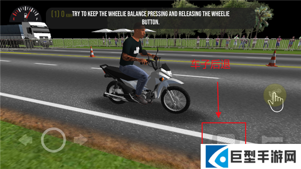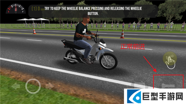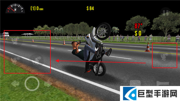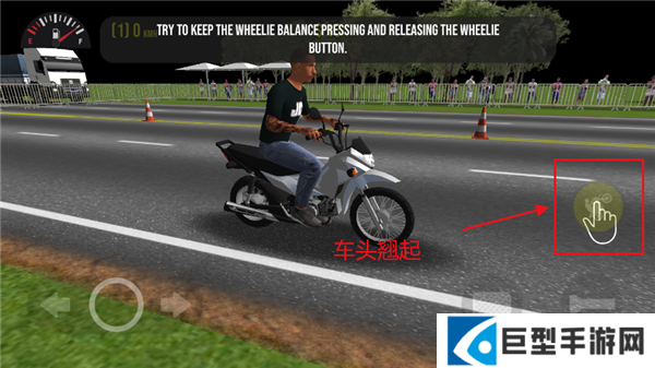 2、屏幕右边第一个动作是摩托车头翘起来,和驾驶一起按就是车头翘起前进的特技。