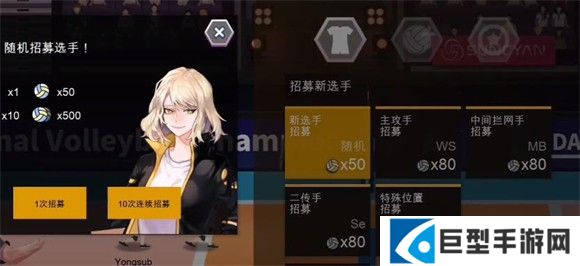 1、在主界面点击商店就可以进入招募球员界面,共有五种招募方式,分别是随机招募、招募主攻手、招募拦网手、招募二传手、特殊位置招募五种,后面四种需要的资源更多。