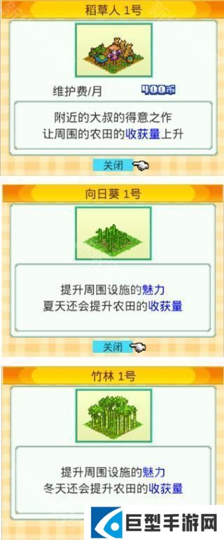 除了道具外,建设适当的环境设施也可以提高作物产量。稻草人就在提升产量上十分有效。此外,还有些环境设施会根据季节来对产量进行加成,如竹林可以提高冬天的收成、向日葵可以提高夏天的收成等等。
