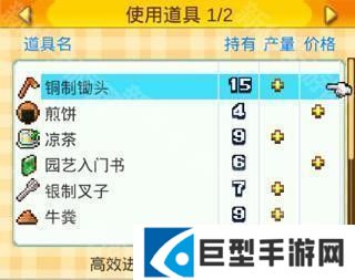 游戏中有很多道具,可以增加作物的各种参数,其中有些特定的道具就可以提高特定作物的产量。例如铜制锄头、牛凤、银制叉子等可以提高草莓的产量、银制锄头可以提高洋葱的产量等等。