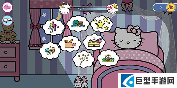 8、凯蒂猫已经睡着了,但是有许多【梦境】会以气泡显示出来,随意点击一个就可以开始游玩梦境。