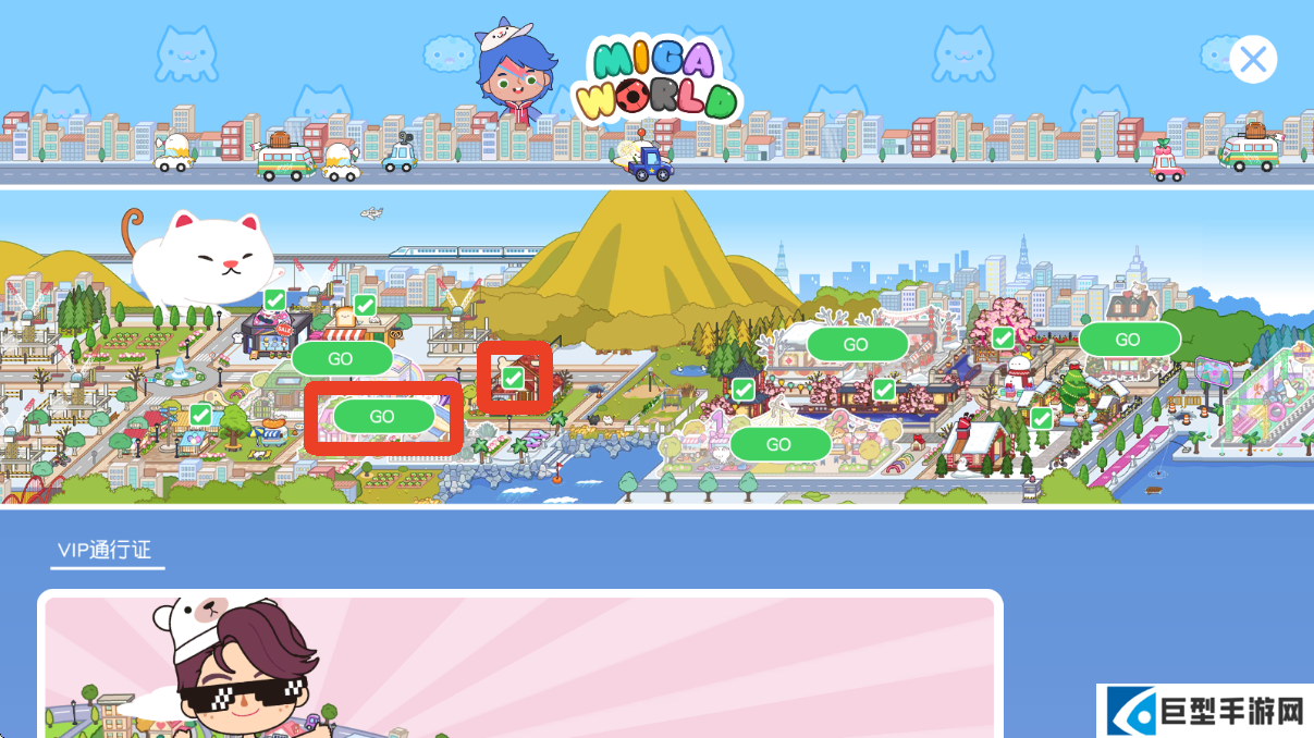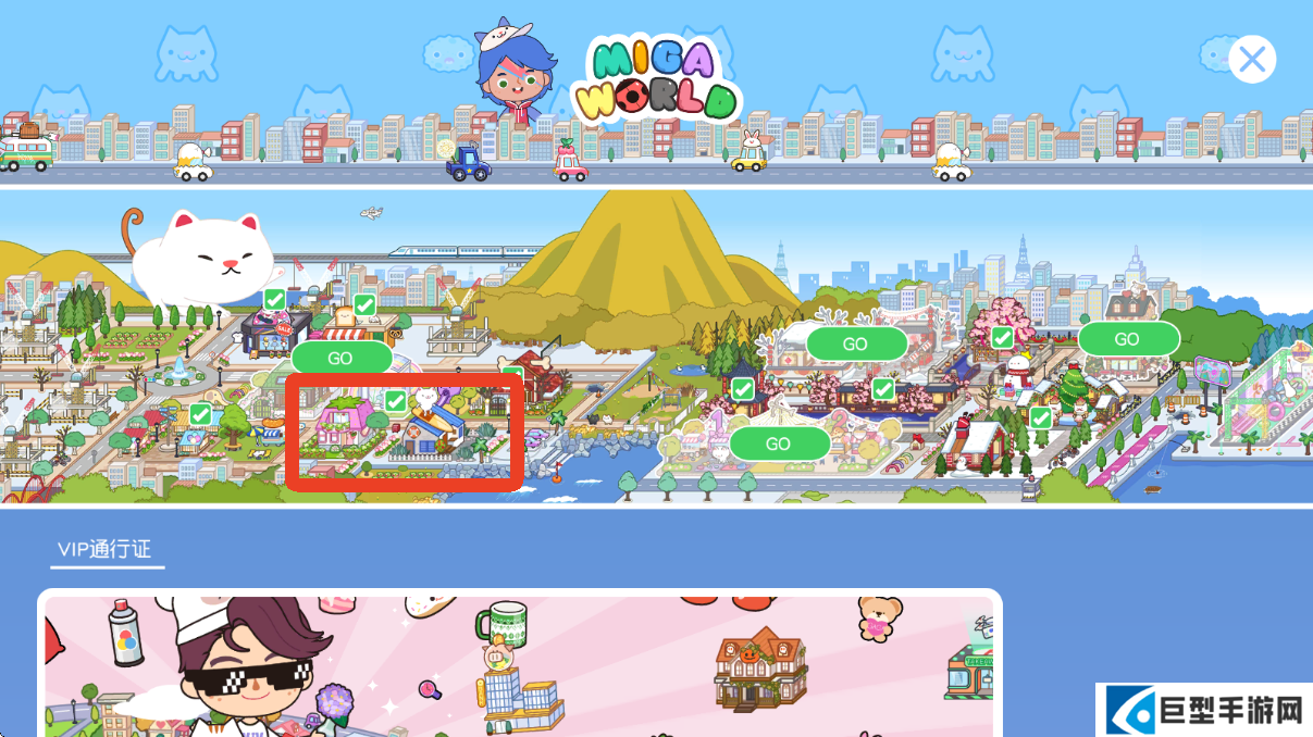 2、点开商城可以看到整个米加小镇的地图,建筑上方有绿色的√说明已经解锁了,找到你想解锁的地方,点击上面的GO字样。