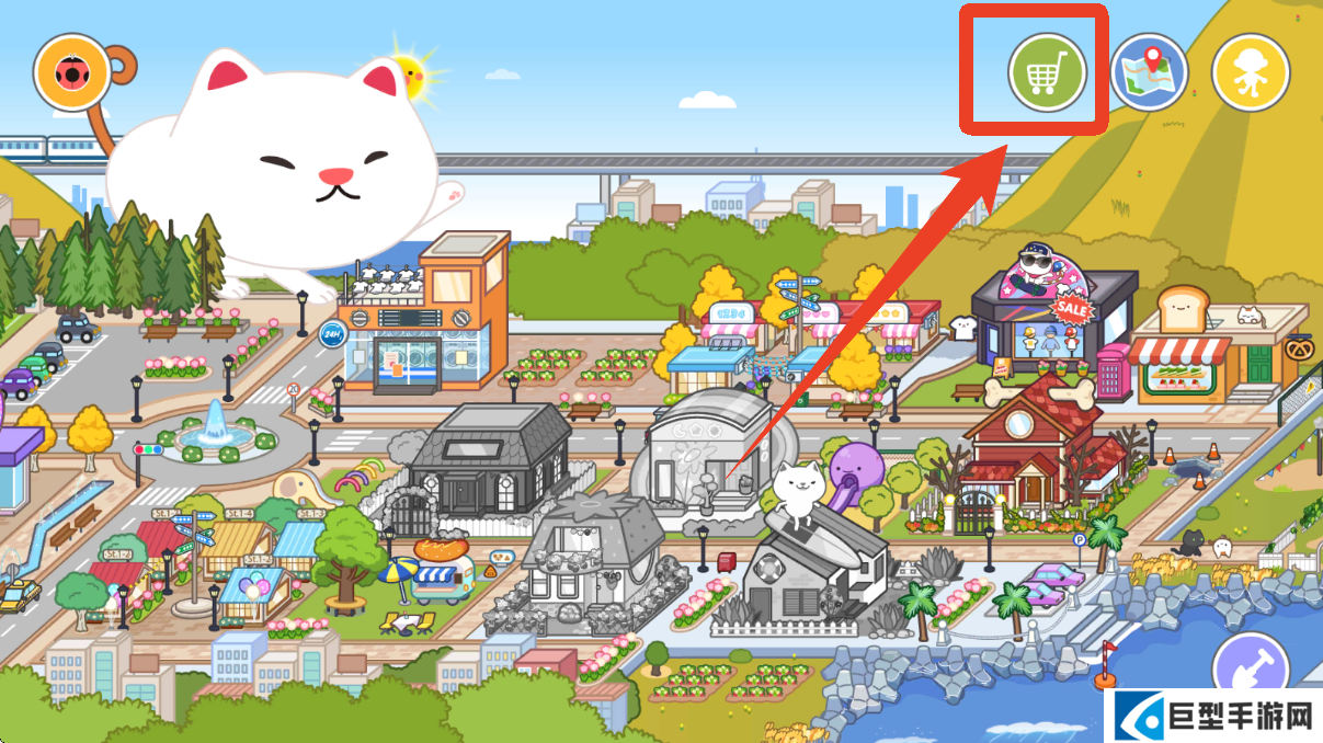 1、在本站下载米加小镇世界游戏后你会看到有些建筑是灰色的,这时候我们就需要去解锁,进入到游戏内点击右上角商店标识。