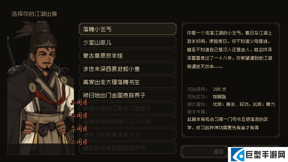 4、还可以选择你的江湖出身,如乞丐、孤儿、放羊娃等等;