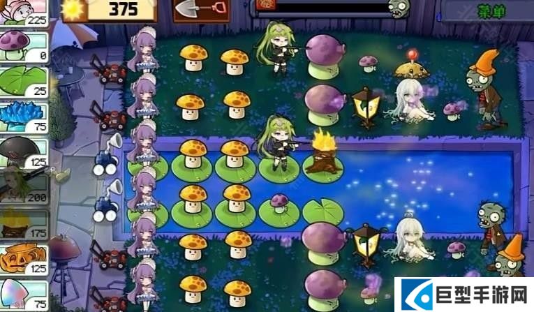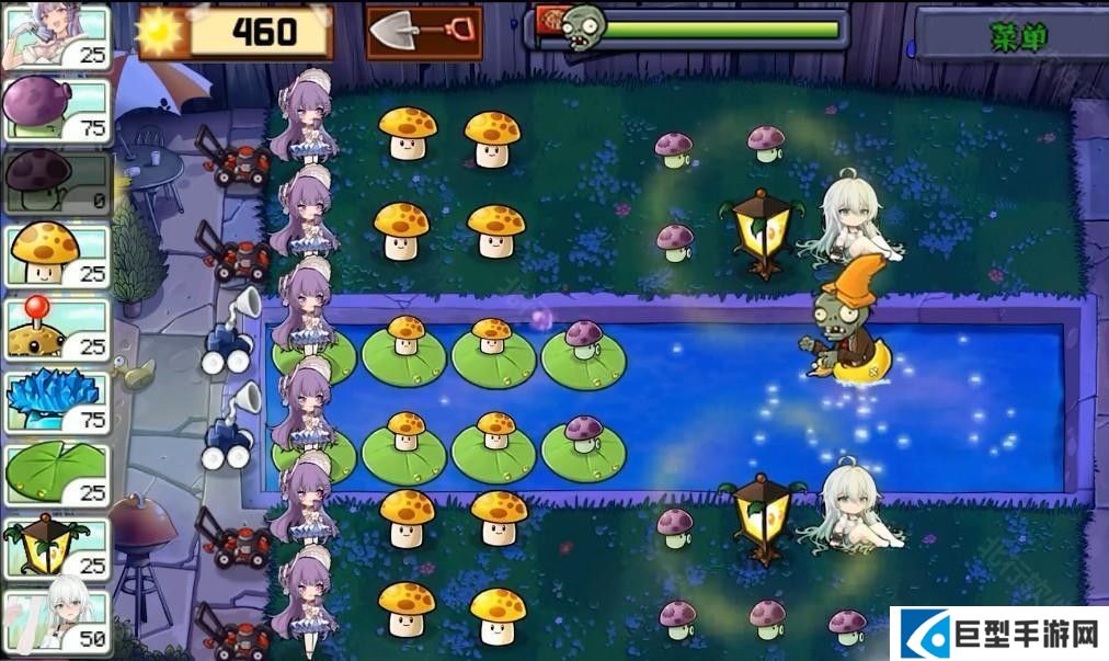 4、然后种植蘑菇不断收集阳谷,布置植物娘位置,消灭僵尸。成功抵挡所有僵尸即可通关,反之让僵尸进入房屋则通关失败。