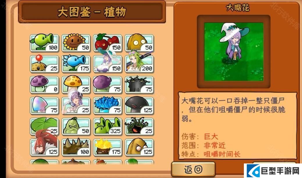 2、点击右下角的图鉴查看娘化的植物和僵尸,新手可以查看每只植物娘有什么作用(其实和原版对应的植物功效差不多)。