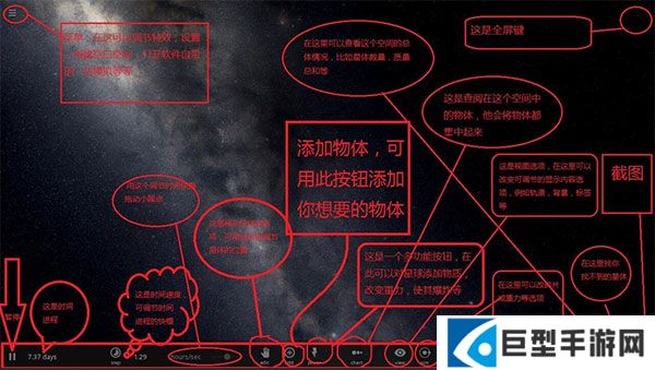 这是添加物体的一个按钮。你可以在这里添加你想要添加的各种星体、物体,让他们在这个空间中运行。