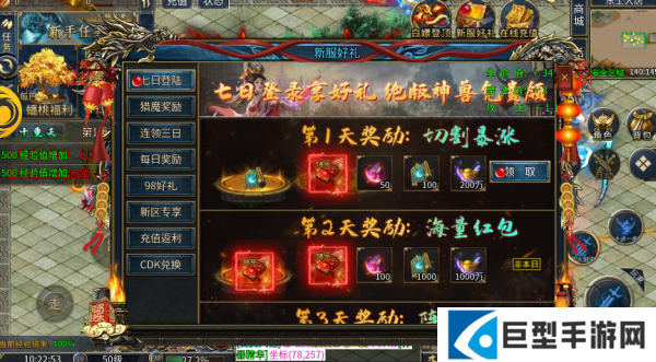 1、上线即可领取自动回收,满格背包,地图多,boss多,将不需要的装备进行回收。
