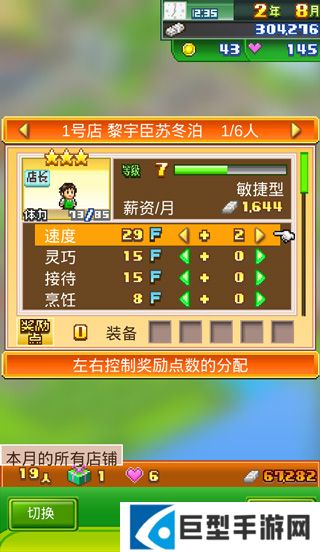 速度,灵巧,接待,烹饪:这是员工的能力数据,在游戏内系统游戏说明中有详细内容,不同属性的员工应搭配不同的店铺。