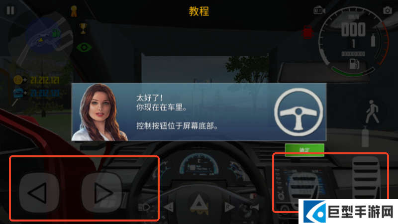 4、上车后,左边按钮是控制方向,右边按钮有刹车和油门;