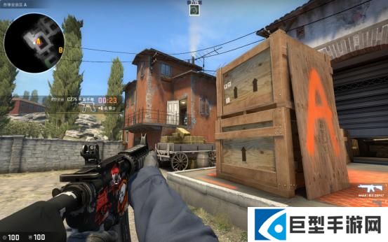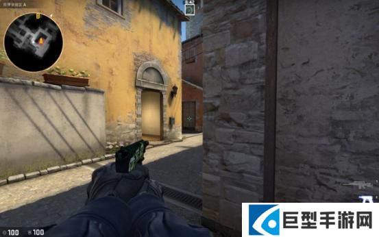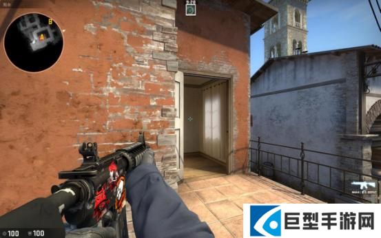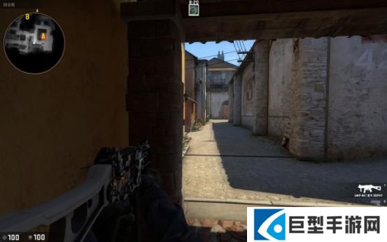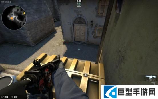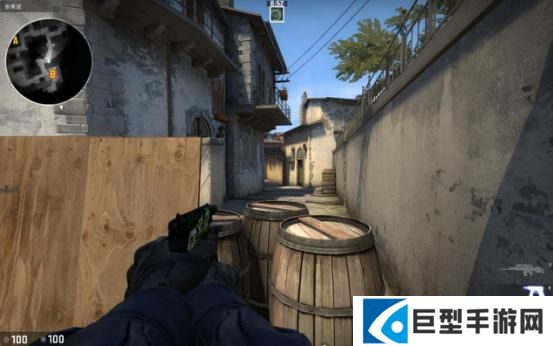 当T进攻B点断后的时候,站这里比贴墙好的原因是因为地图的改动,香蕉道门口两边都可以站人,此时如果对手稍有头脑就会先看右边(图中准星瞄准的地方)再来检查左边,此时你完全可以提前半个身位知道他的动向。