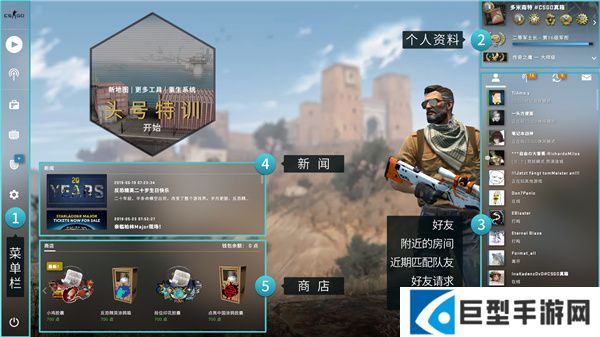 1、主界面:点击主面板(左上角CS:GO图标),无论在哪个栏目均会回到如图的CS:GO主界面。
