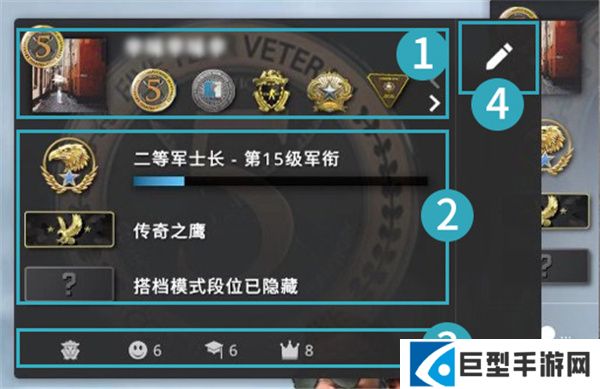 2、位置2:经验军衔、经验等级和经验值、竞技模式段位、搭档模式段位。