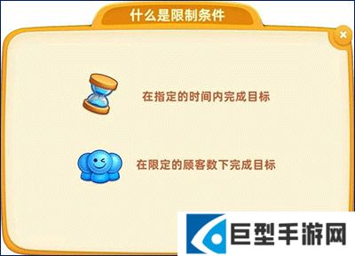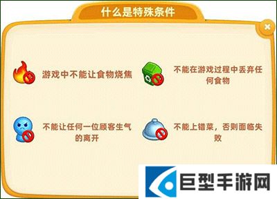 特殊条件是指关卡的限制条件。如不能烧焦、不能上错菜等,在进入关卡时会有特别说明(如图)。一旦不小心触发,就会判定挑战失败,大厨需要特别注意限制条件哦。
