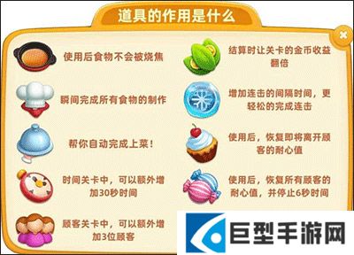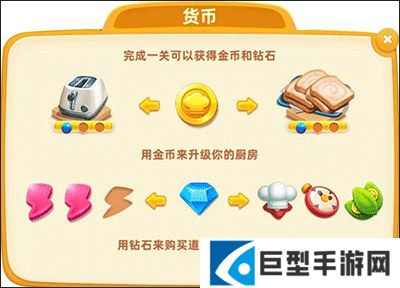 1、金币:完成关卡可以获得本关产出的金币(双倍加成道具、连击均可以提高金币的产出);金币用于升级设备和食材。