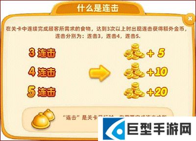 连击要求大厨在关卡中连续完成顾客所需求的食物,连续上菜达到3次以上时出现连击并可获得额外金币(两次及以下不计算连击)。最高连击为5连击,可额外增加20金币。