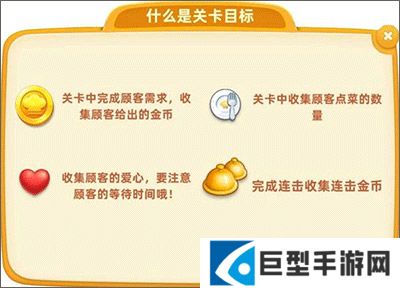 1、金币:即金币关卡。通过完成顾客需求,收集顾客支付的金币,达到目标营收金额。