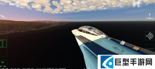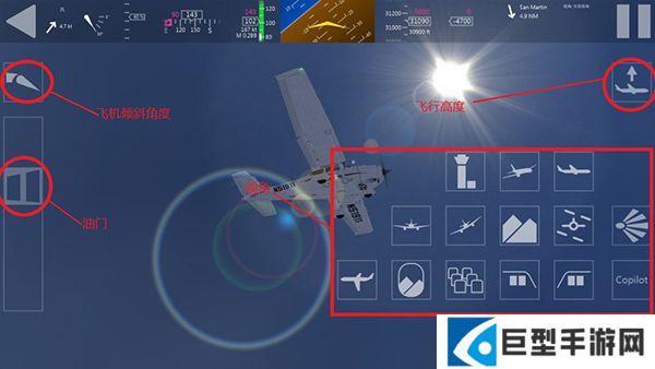 3、玩家进入游戏之后可以看到左右两边有控制按钮,左边是飞机倾斜角度以及油门,右边可以调节视角和飞行高度。