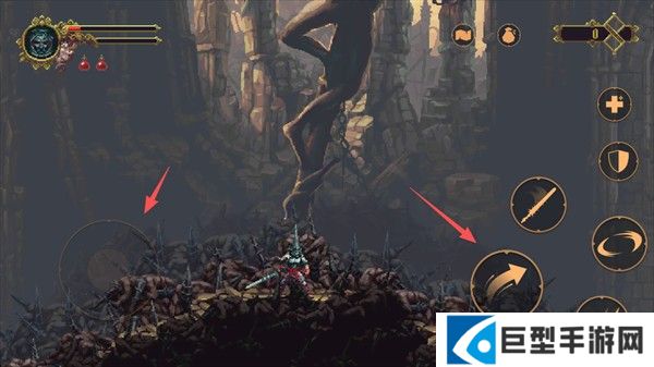 使用屏幕左侧的控制轮盘移动角色,右侧按钮则负责防御和攻击。