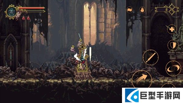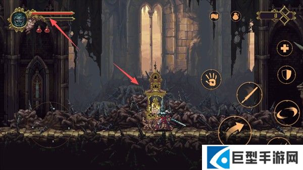 上方显示的是角色的血条,当血量耗尽时,可以在神像前回血,或者点击右侧的【+号】使用药水进行恢复。