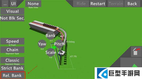 4、点击"Rel.Bank"按钮,我们可以以地图或以前一节轨道为基准让轨道进行倾斜;