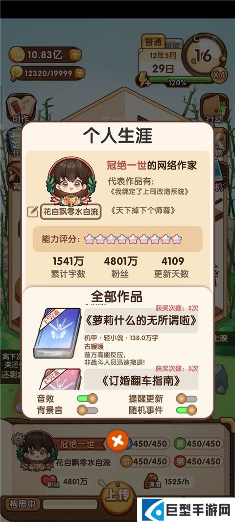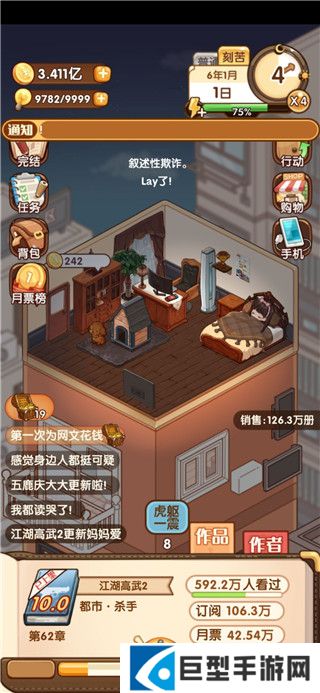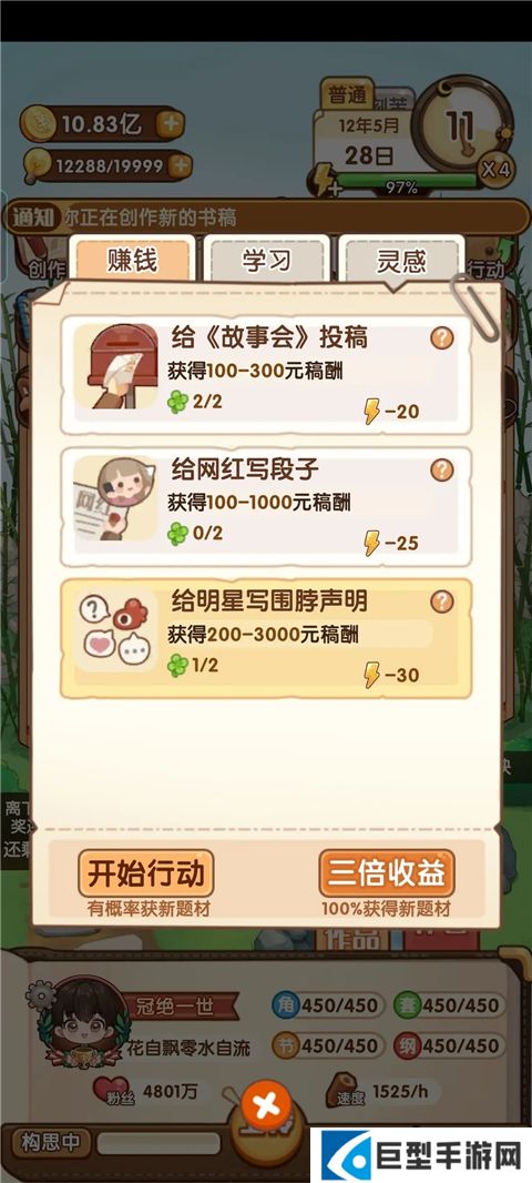 2、buff加成选择两个写作速度,提高15%,然后可以选择“虎躯一震”,写完两章后有几率加体力。买到第四套房子后靠着这个加成可以全天候“刻苦”写作+刷满灵感+灵感满后多余体力可以刷【行动—赚钱】获取题材。金手指加满+电脑加满,基本可以保持1753左右的写作速度,一个多月完成一本102章作品(98章选择完结拿到完结奖励),卡在月半完结开下一本,基本可以拿到月末的一二等奖。