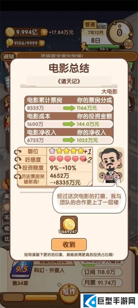 7、电影投资,选择比自己当前作品低两个等级的导演时把投资金额拉满,一般有得赚,但不如同等级的即便亏但钱多。同等级不推荐投资。