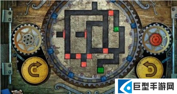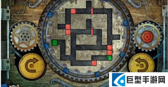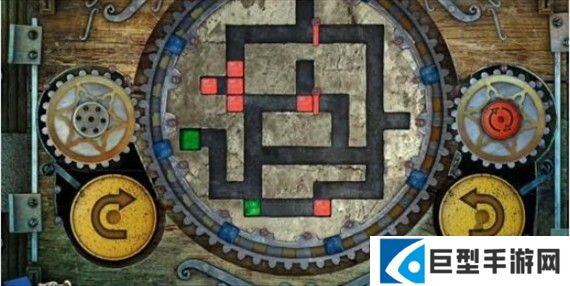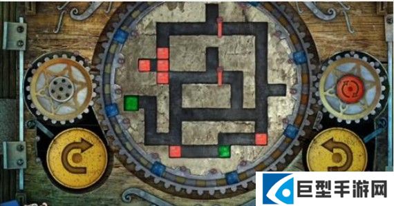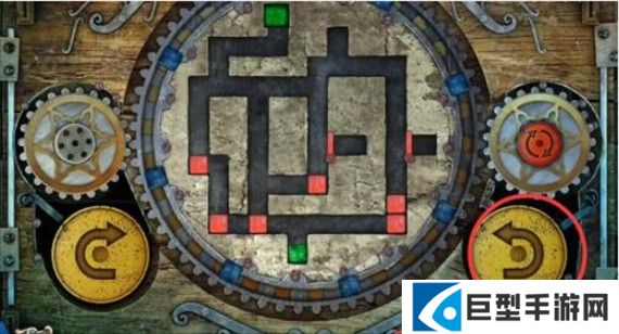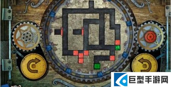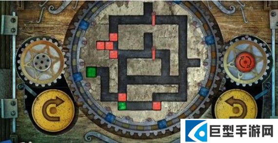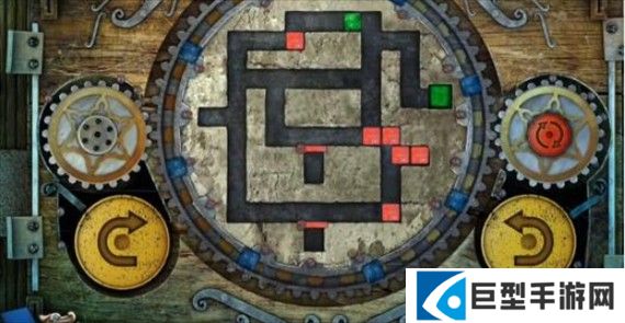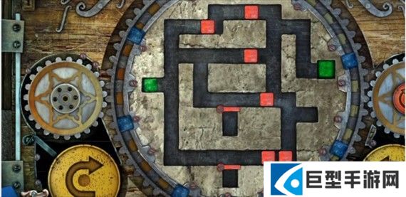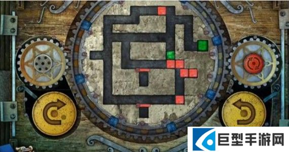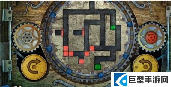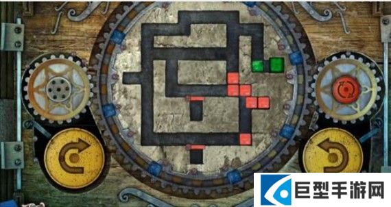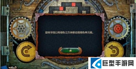 17、最后,点击左边黄色的旋转按钮一下,中间的大齿轮会顺时针旋转一次,旋转后的立方体位置如图,此时的绿色立方体已经进入了绿色的单元格内,即可通关,门就打开了。