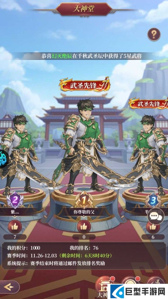 3、每七天为一个赛季,每个赛季在第七天的21:00结算排名奖励,23:59结算后的演武场积分为当前的70%,最低1000分