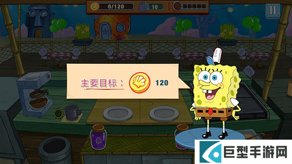 1、首先打开海绵宝宝大闹蟹堡王官方最新版,在开局都有一个小目标,玩家只需完成目标,即可通关;