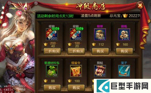 建立角色前7日,每日均会开放一个冲级商店,在商店中除了能买到铜钱粮草等游戏资源外,还可以超低价值购买2份经验值。