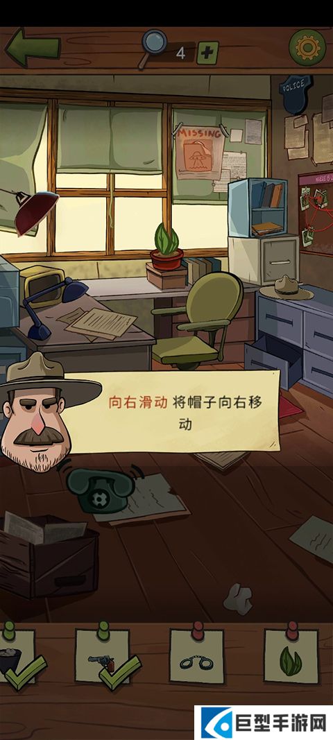 2、开始寻找乔吧,将下方便签中的物品统统在房间内找到,比如向右滑动帽子,你会发现一个铰链,点击它将这个作为案件线索收集起来吧。