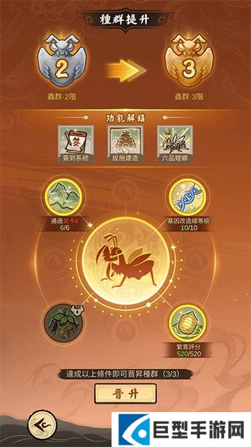6、随着通关次数增加,将逐步解锁更高的种群等级与螳螂阶级,玩家还可通过升级与基因改造,不断打造属于自己的最强螳螂军团。