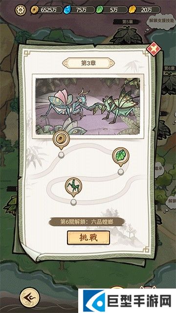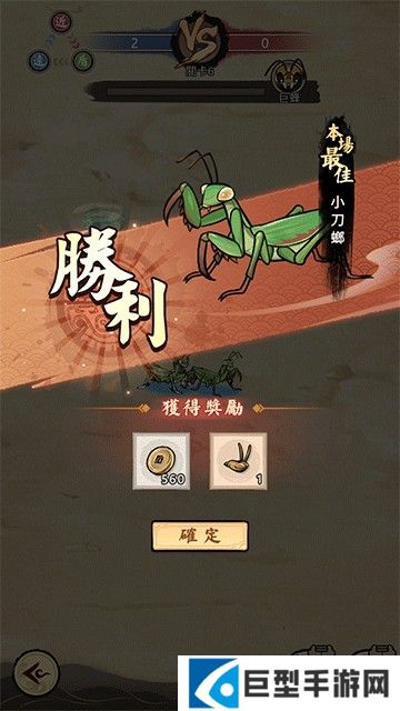 5、阵容确定后点击“开战”,螳螂会自动作战。胜利后可选择继续挑战下一关,或返回孵化更强的螳螂。