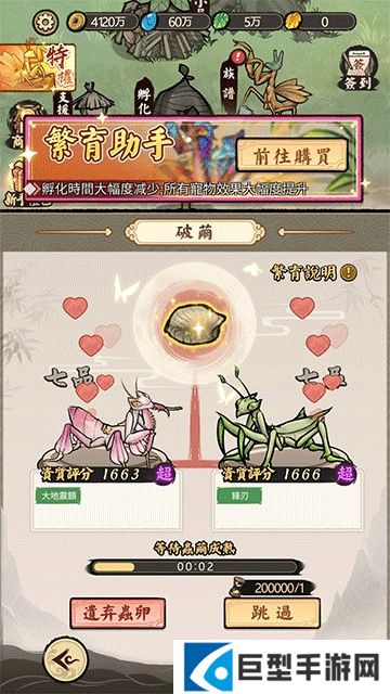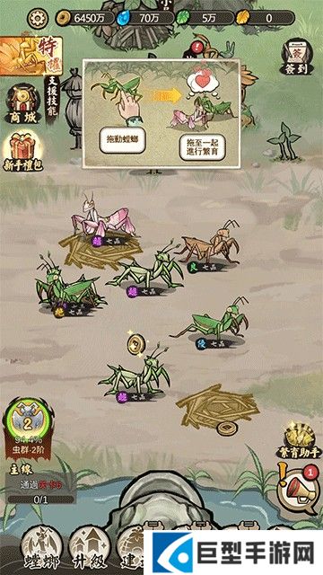 1、进入游戏后,玩家即可开始培养属于自己的螳螂。将两只螳螂拖拽到一起即可进行繁育,从而获得品质更高的新螳螂。
