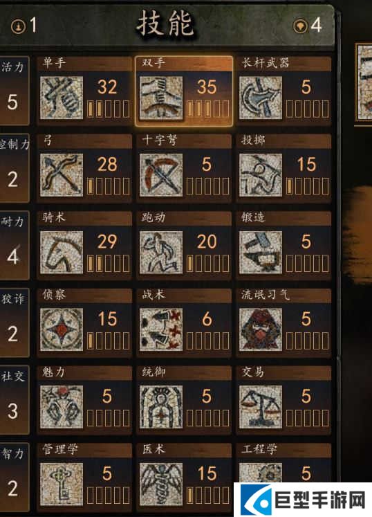 2、统御,教练也合并到这里了,前期先把教练的效果点出来就行了,加士气什么的用不着,反正前期一不打吃亏仗二不带太多人(大地图跑得慢);