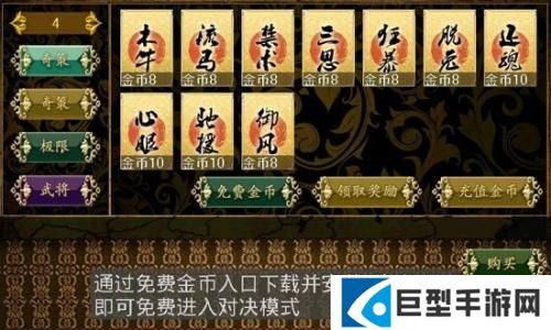 系统随机为玩家选择几名角色,需消耗1金币,在此模式中,玩家可以赢得战功,金币和道具卡(不包括武将卡)