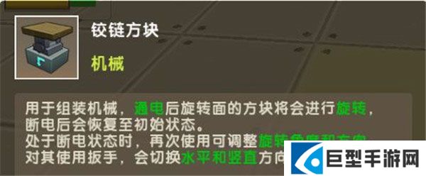 铰链方块只能用在机械中才会生效,通电后旋转面的方块会进行旋转。装在铰链方块旋转面的方块会被带动旋转,在飞行载具中,铰链方块可以用来带动机翼或者尾翼旋转,同时,用扳手点击铰链方块可以切换旋转方向。