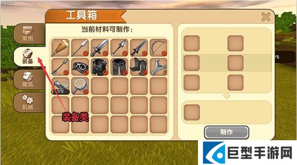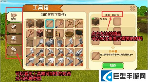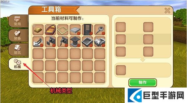 可以看见有很多可以通过工具箱来制作的东西,他们分为四种类型:常用、装备、建筑、机械。