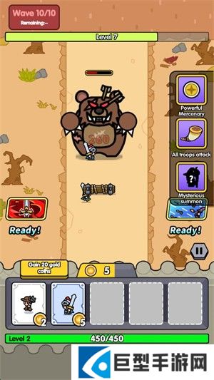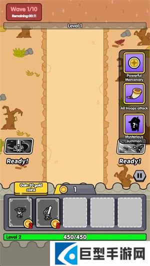 2、进入关卡后玩家需要召唤小兵来对抗敌人,你会逐渐获得金币用来召唤小兵。