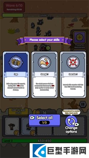 3、召唤不同的小兵需要的金币数量是不一样的,当击败敌人后会获得经验,提升等级后可以选择一个技能来强化小兵。
