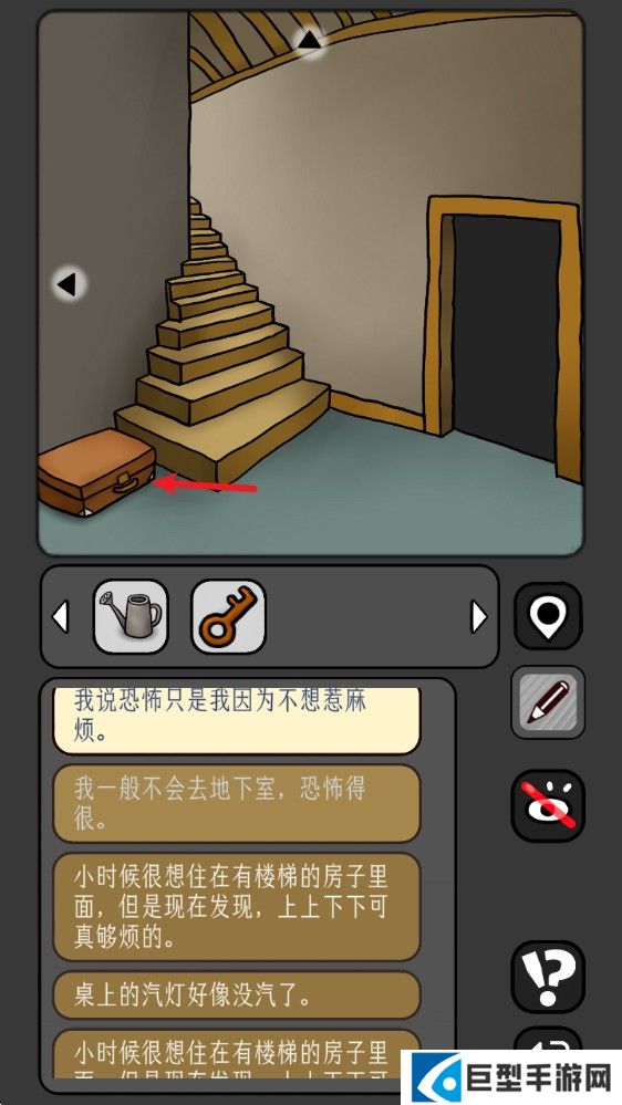 6、回到地下室,点击角落的行李箱,用【钥匙】打开,获得【斧头】和【汽油】。注意纸条上的箭头及纸张折角的位置:左上-下、右上-左、中-上、左下-左、右下-右。