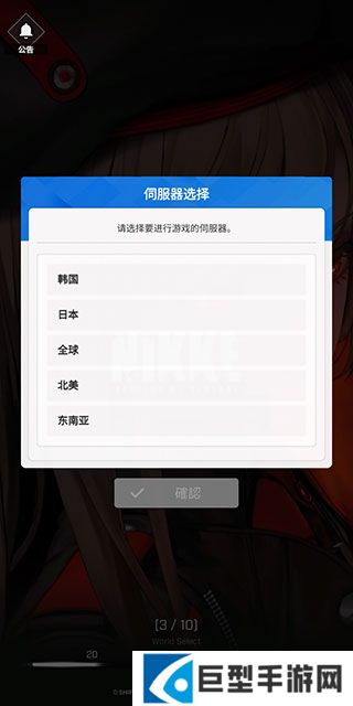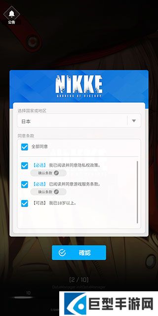 2、首先需要我们选择国家地区(服务器选择在后方),勾选全部同意选项后,之后点击下方确认按钮;
