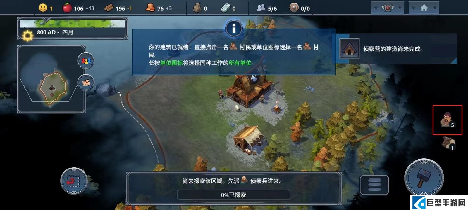7、当建筑建好以后,直接点击游戏中的村民或者点击右下角的村民图标,长按单位图标将选择同种工作的所有单位;