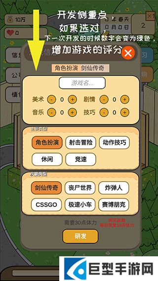 3、关于开发侧重点,如果选对,下一次开发的时候数字会变为绿色,增加游戏的评分。