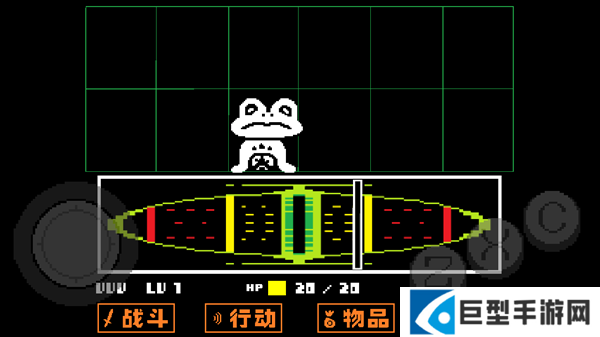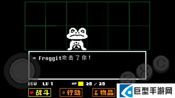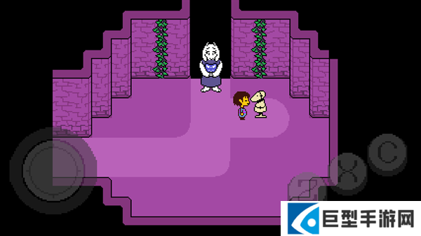4、去到北面的藤蔓房间内会遇到青蛙froggit,选择“行动——赞美”,虽然青蛙不知道你在说什么,但他变得很开心,他就会逃离战斗。在右面的水池上有一个尖刺陷阱,Toriel会牵着你的手通过这个陷阱区域。