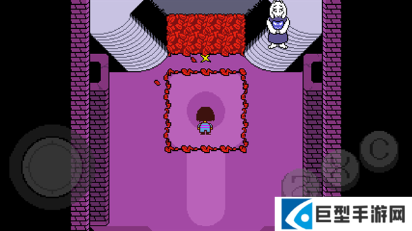 2、跟随着Toriel前往至遗迹的入口,在花丛当中会遇到第一个保存点(星星)。Toriel不假思索地告诉你这里就是你的新家。进入到第一个存档点北面的房间,Toriel会亲自把这个房间的谜题给解决,所以直接穿过北面的门即可。随后进入到东西向并且有两条小溪长廊上,Toriel需要你去拉下墙上有标记的杆子,一共需要拉下两个,那么东面的尖刺陷阱就会被移除。