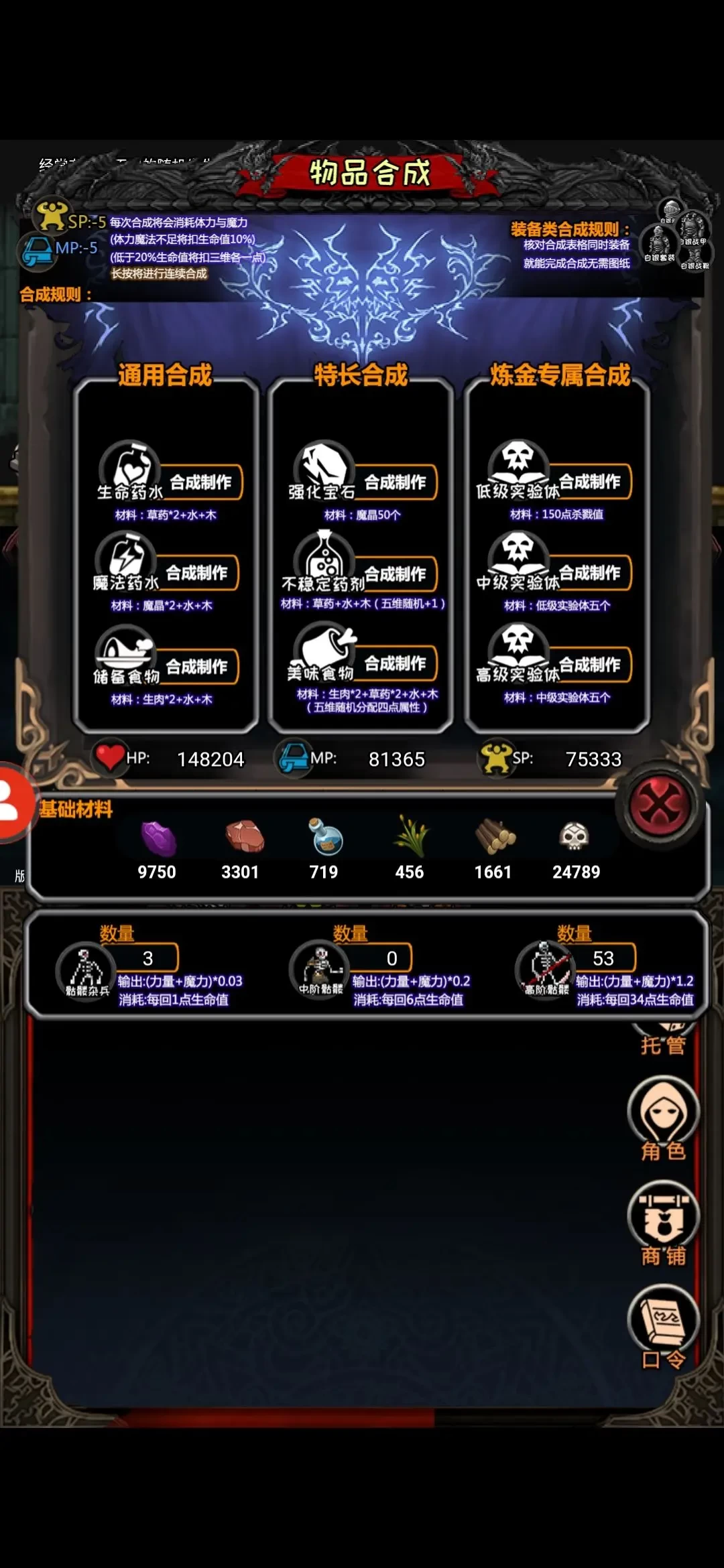 合成主要是合成消耗品,合成公式每一项都有小字说明,合成规则左上角也有文字。消耗品的补给量是按百分比算的。长按可以连续合成,但是体力魔法值不足时扣除的生命值是按上限算的,所以会死人,初期合成需谨慎。