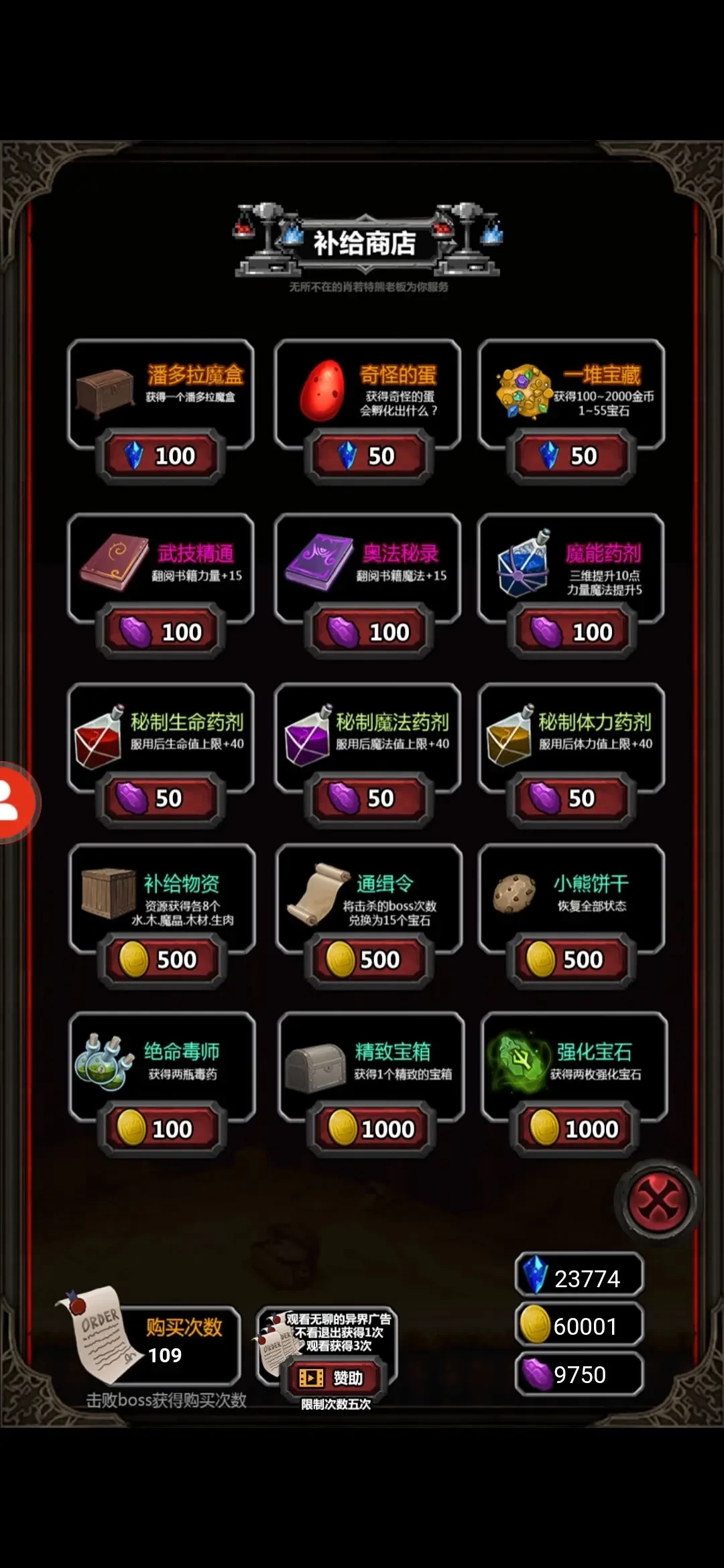 商铺可以消耗宝石、魔晶、金币来购买物资或提升属性。这里提一下金币购买项里的【补给物资】,可以合成药剂来度过刚开局的艰难时期。此外商铺还可以快速消耗金币来配合达成【七宗罪-嫉妒】。