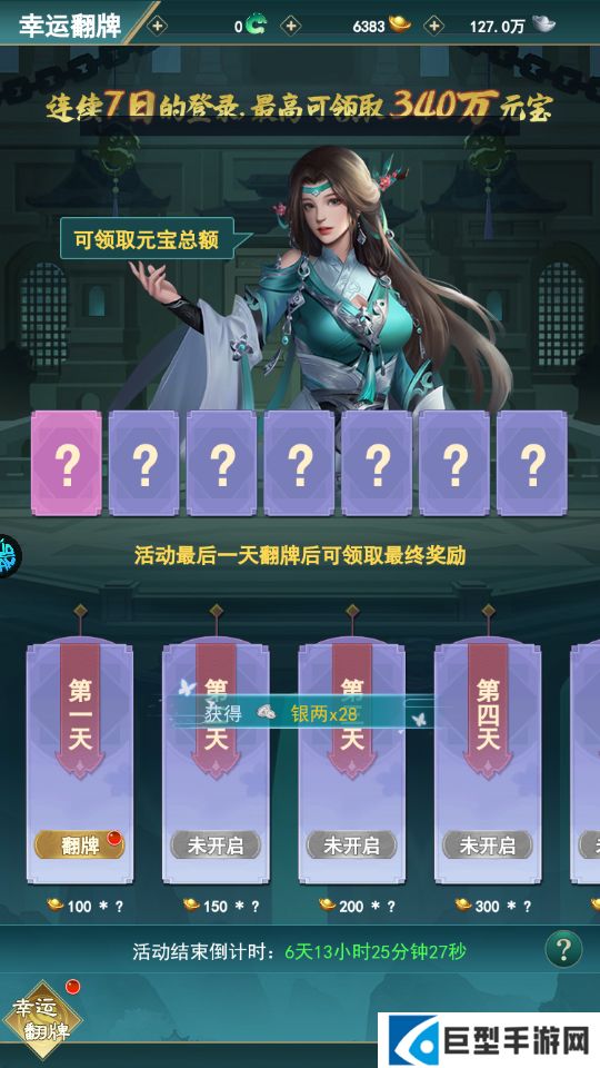 3、每日签到,还可以翻牌领取元宝,连续七日签到更是有百万元宝等你来领取;